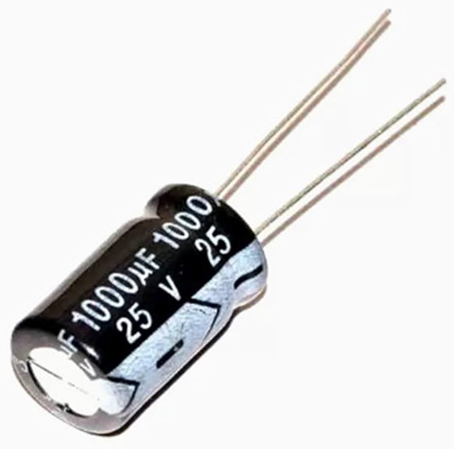 Electrolytic capacitor rated for 1000µF (microfarads) and 25V (volts) with dimensions of 10mm diameter by 17mm length is a common, general-purpose through-hole component (often radial). Designed for power supply filtering, audio circuits, and DIY electronics, these components typically feature a \(\pm 20\%\) tolerance, 105°C temperature rating, and 5mm lead pitch.